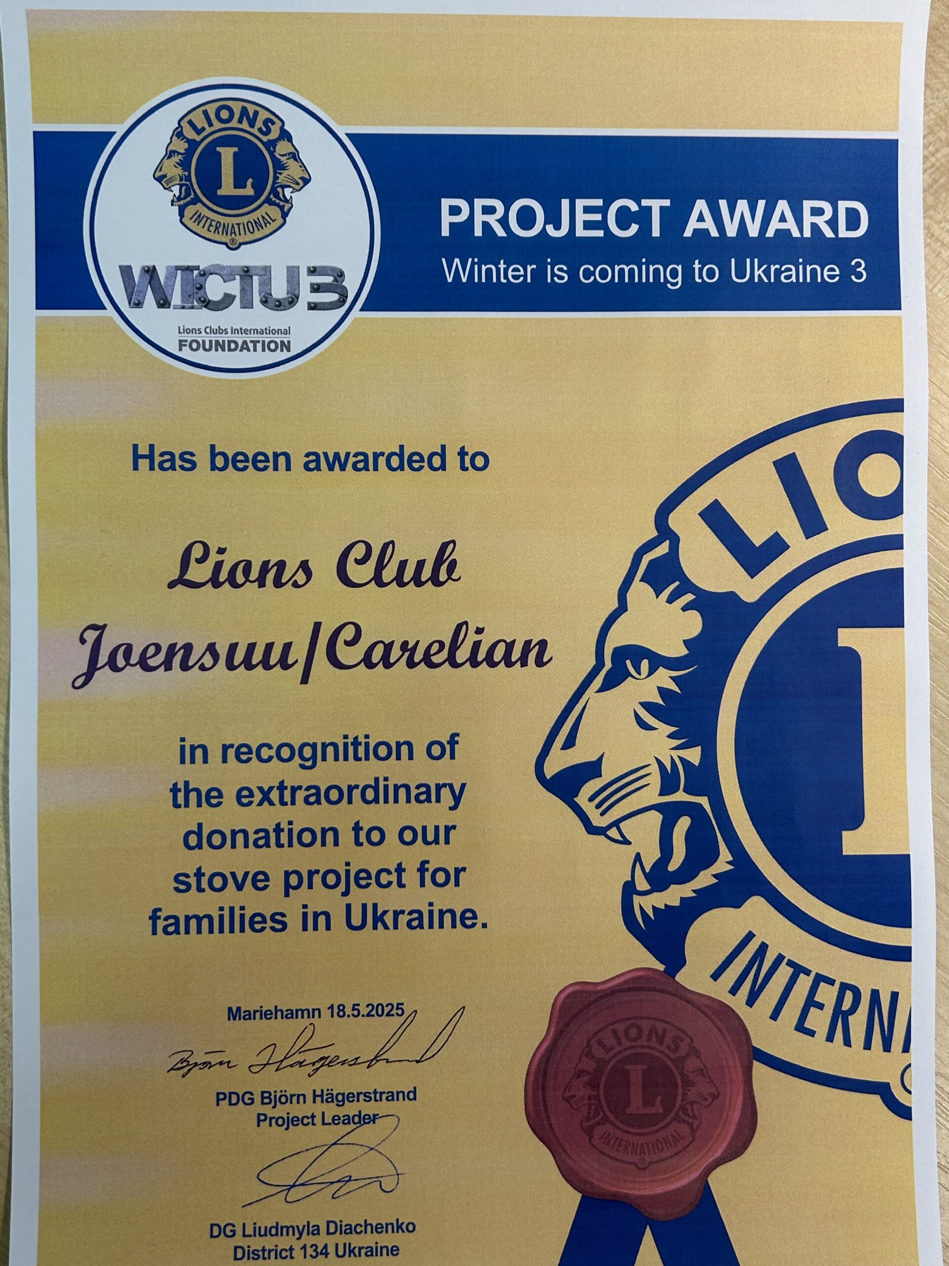 Klubimme sai kansainvälisen kunniakirjan lahjoituksestamme Ukrainan puukamiinakeräykseen. Koko Suomen keräyksen tuotto oli 206.875,17 €, jossa olimme osaltamme mukana. Kaikkiaan 320 klubia ja 105 yksityistä lionia